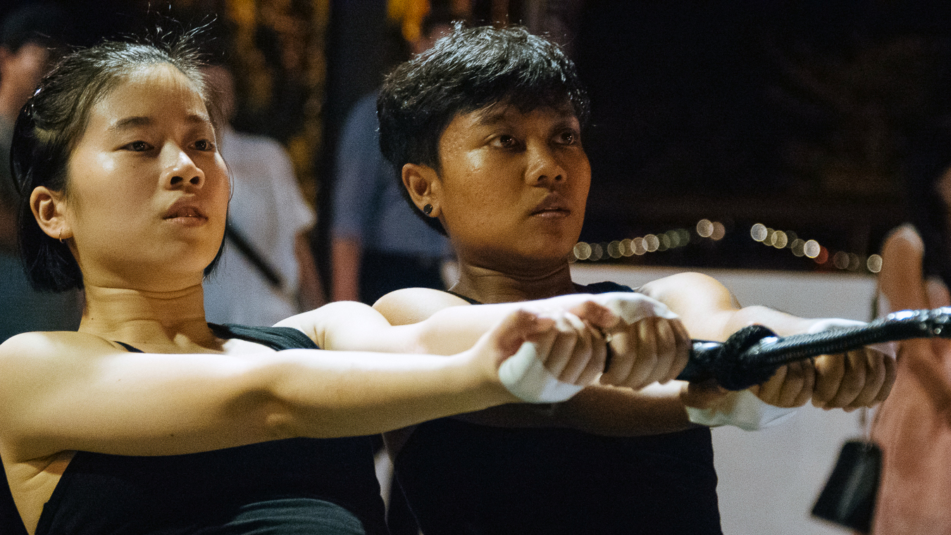 Parade, 2014, installation and performance, steel ladders, wooden objects, rope and steel pulleys, 12 hours, dimensions variable