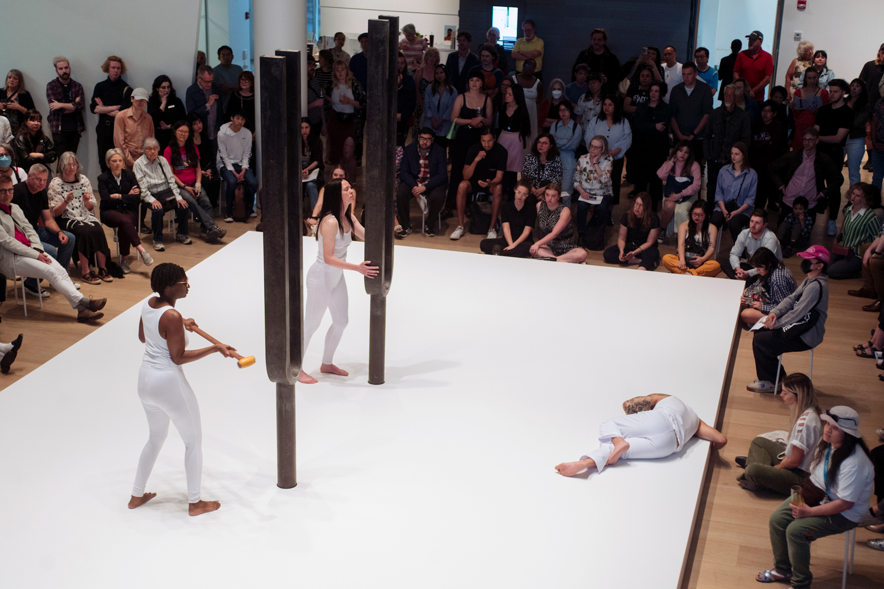 First Sound, Last Sound, 2022, two steel tuning forks, wooden resonance chamber, performers in white costume, 3m x 32.5cm x 15cm each, 30m x 5.75m, 20 minutes. Photo: Zan Wimberley