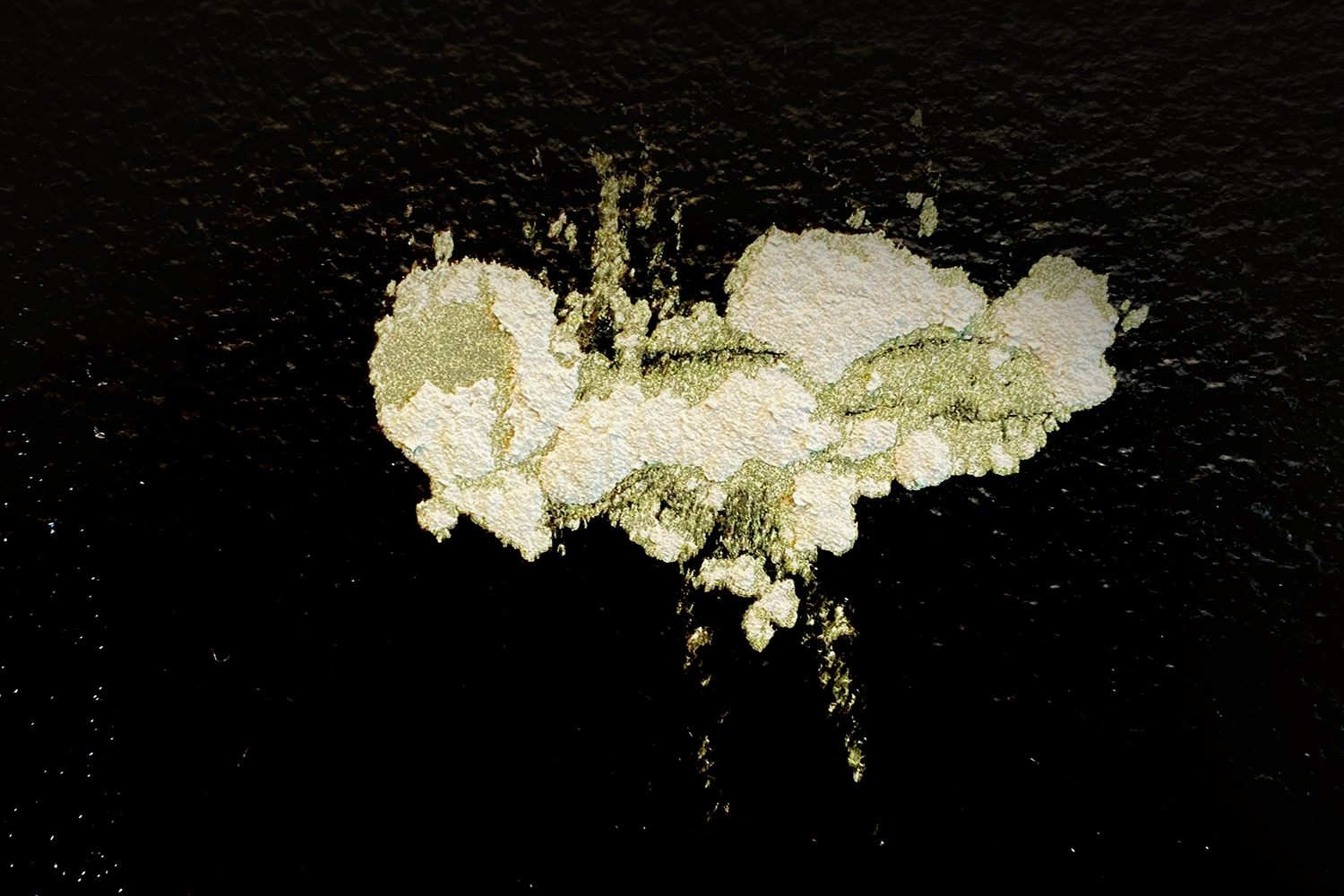 My heart beneath the earth, 2023, acrylic paint, titanium, hematite, silver, zeolite, phosphorescence, bronze, and ochre on wall, dimensions variable. Photo: John Dean