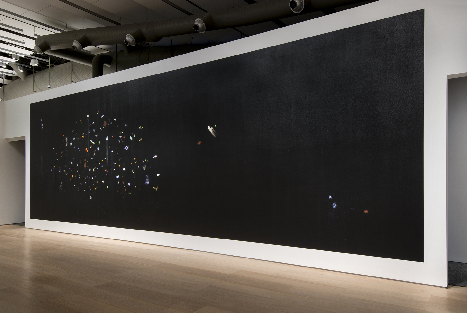 My Heart Beneath the Earth, 2023, Acrylic paint on wall with titanium, hematite, azurite, silver, zeolite, phosphorescence, bronze and ochre, 5m x 17m. Photo: Andrew Curtis.