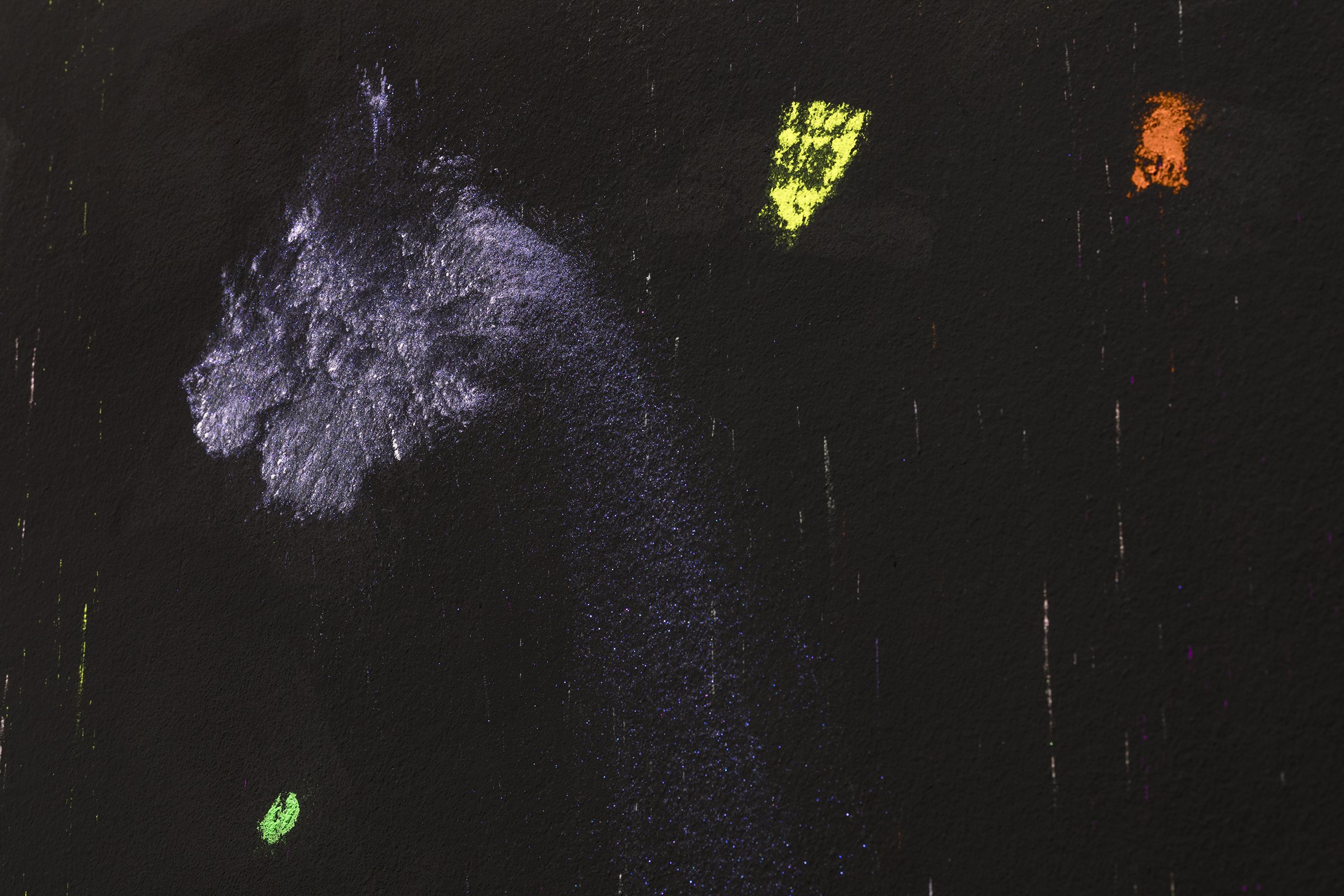 My heart beneath the earth, 2023, acrylic paint, titanium, hematite, silver, zeolite, phosphorescence, bronze, and ochre on wall, dimensions variable. Photo: Romain Darnaud